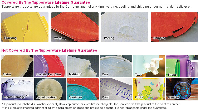 - This is a picture of what is covered. However, I personally only take care of cracked and chipping because sometimes warping and peeling is due to misuse. If you see those items I recommend having it go to Tupperware directly. If you warranty something they do not feel is warrantable they will charge you for the part