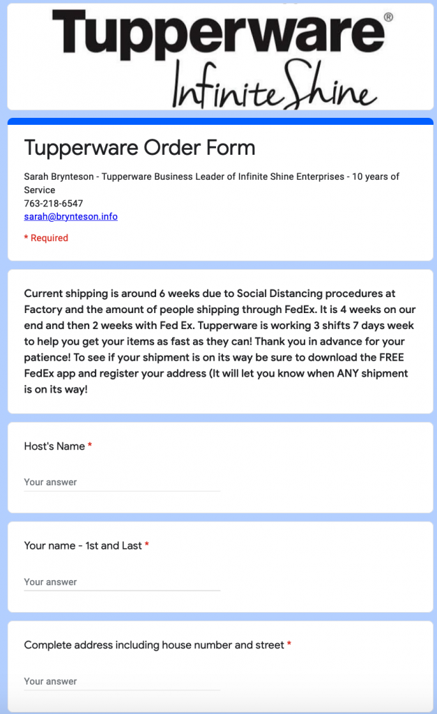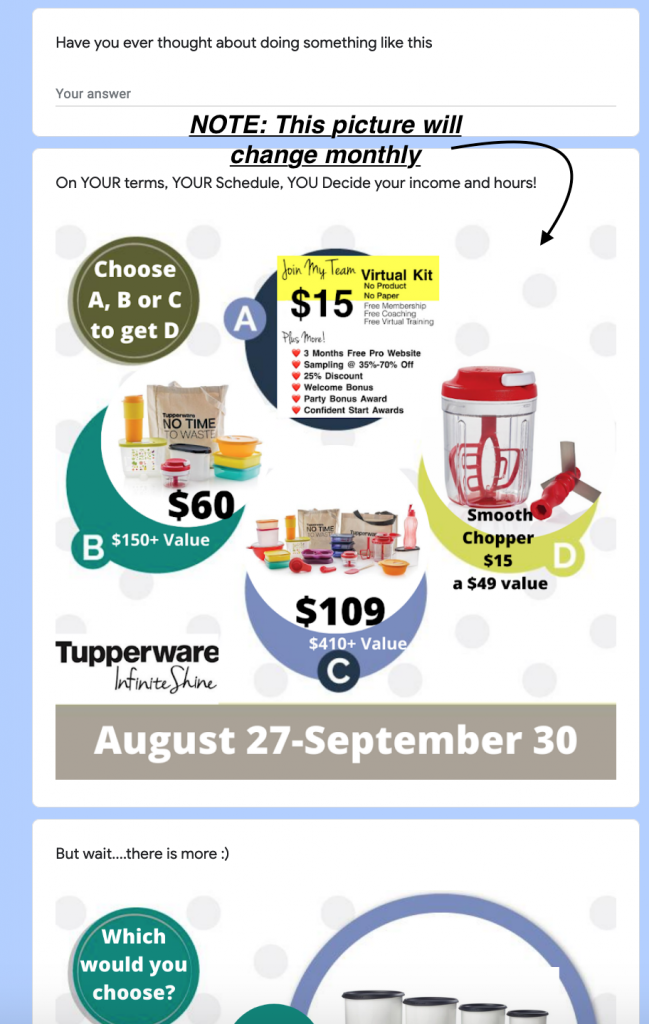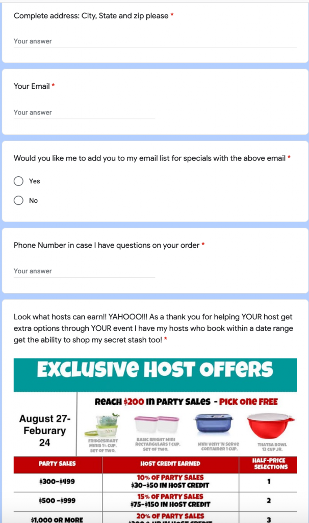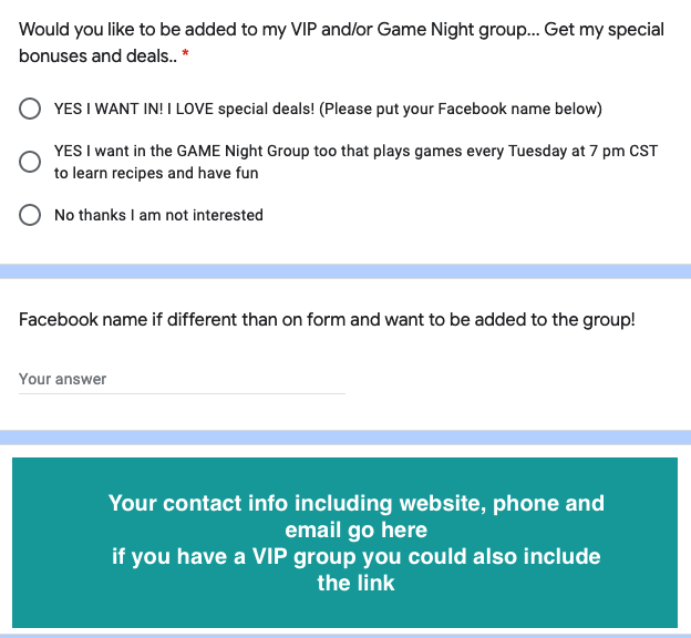 I use a google form for all my Virtual events. Here is how to create one. To have access to the most current one to copy please send me a note to request to edit it via Messenger, Email or text!