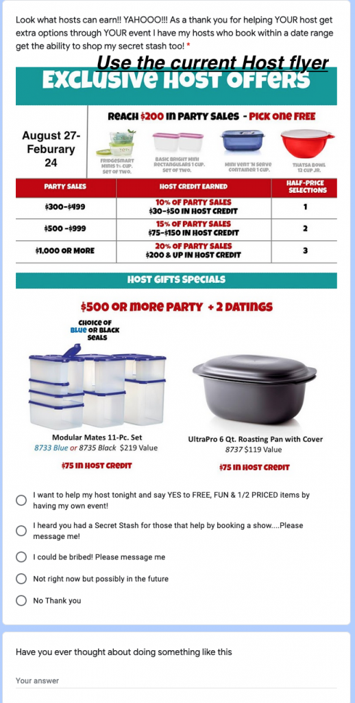“Standard” Host Packet: 4 catalogs, 4 flyers, the Recruiting flyer from Tupperware, Confirmation Email, 2 back to back order forms and How to have a $1000 party. 1 smidget as the gift for hosting (2 if they book before the party is booked before the one they are at holds) I do recommend the Priority Mail envelope for this packet